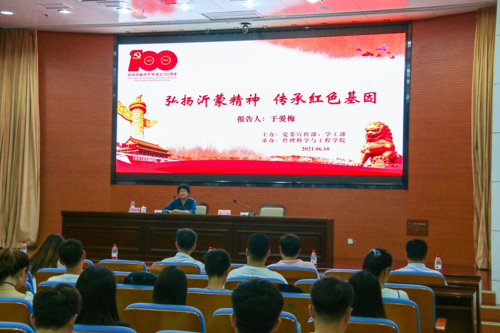 6月10日下午2:00,由学校党委宣传部、学生工作部、管理科学与工程学院党委联合举办的沂蒙精神专题宣讲报告会,在燕山校区图书馆第一报告厅举行。沂蒙精神宣讲人于爱梅作了题为《弘扬沂蒙精神,传承红色基因》的专题报告。报告会由管理科学与工程学院党委书记李军主持,党委宣传部、学生工作部负责人和部分学院的党委副书记、辅导员以及燕山校区部分党员、入党积极分子代表聆听了报告。