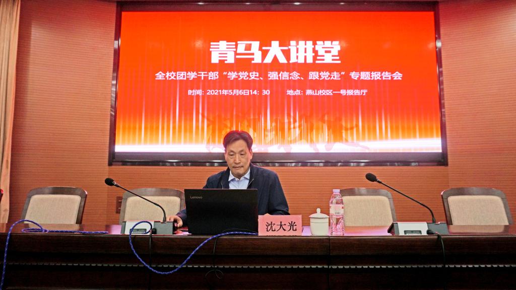 5月6日下午,学校共青团在燕山校区图书馆一号报告厅举行“青马大讲堂”全校团学干部学党史、强信念、跟党走专题报告会,邀请马克思主义学院院长沈大光教授作辅导报告。校团委全体干部、各学院团委书记、团委委员、青马班、校学生会、校研究生会代表共150余人参加报告会。会议由团委副书记甘超主持。
