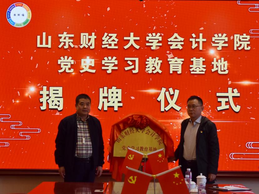 4月16日下午,会计学院党史学习教育基地揭牌仪式在奥斯福集团成功举行,会计学院党委书记邵文涛、奥斯福集团董事长李明共同为“山东财经大学会计学院党史学习教育基地”揭牌,各党支部书记和学生党员代表出席仪式。